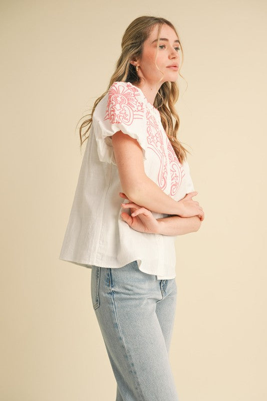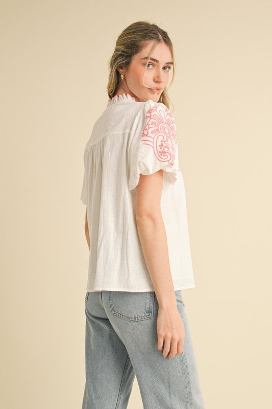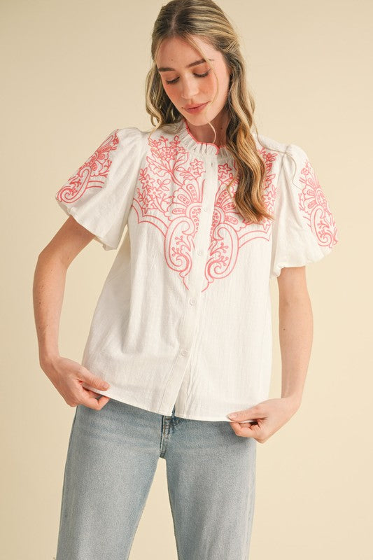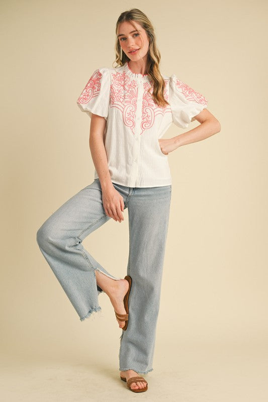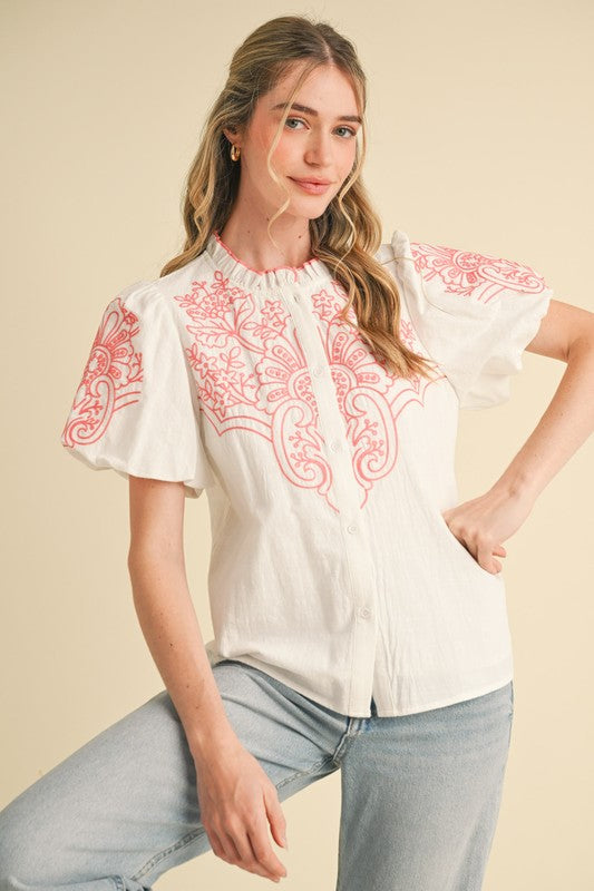 Embroidered button down bubble sleeve top + High ruffled neckline with button-down placket + Embroidery on front bodice + Short bubble sleeves with embroidery + Relaxed fit Lined + Model is 5' 7" 33-24-34, and wears a S